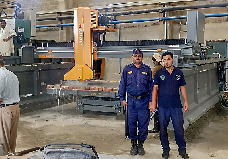 该机采用(yòng)PLC可(kě)编程控制系统和人机操作(zuò)界面,辅以高精(jīng)度旋转编码器定位及红外線(xiàn)标線(xiàn)器,左右走刀(dāo)采用(yòng)变频器控制,可(kě)根据石材材质(zhì)进行调速,上下升降采用(yòng)液压升降,关键部位均采用(yòng)进口零配件,因而具(jù)有(yǒu)切割效率高、切割精(jīng)度高、稳定性高、操作(zuò)简便等优点,特别适用(yòng)于高价值大规格花(huā)岗岩、大理(lǐ)石板材的切割。